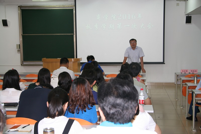 王国顺院长向全院教职工说明了学校领导班子新的分工调整,并传达学校“双一流建设及学科发展培训会”的会议精神,希望大家向“369”和“421”的建设目标不断努力。他还将2016秋季学期的重点工作一一进行了部署,本学期要在本科教学、学风建设、硕士生管理、科研、队伍建设等方面取得稳步进展,实现新的突破。