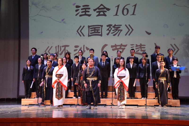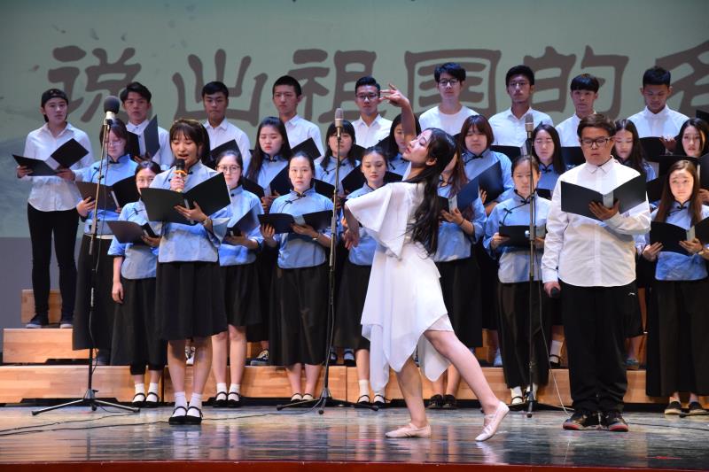 本次比赛共分为碧血丹心、铮铮铁骨、山河赞歌三个篇章。 比赛在一首《将进酒》的诵读中拉开帷幕,学生意气风发、气势磅礴的朗诵,赢得在场观众掌声阵阵;《忆往昔岁月,看今朝少年》又把师生带回革命的年代,感受顽强不屈的民族之魂;《祖国!我亲爱的祖国》大气磅礴,引得在场观众斗志昂扬。从深情款款的《我用残损的手掌》到慷慨激昂的《我爱你中国》;从热血沸腾的《精忠报国》到豪情满怀的《我骄傲,我是中国人》,同学们将对历史的缅怀,对先辈的礼赞,对祖国的歌唱,对和平的呼唤,化成口中抑扬顿挫的篇章。压轴出场的《渔舟唱晚》古筝表演,使老师和同学们从激动的心情中渐渐平复下来。