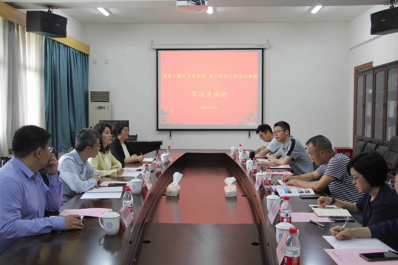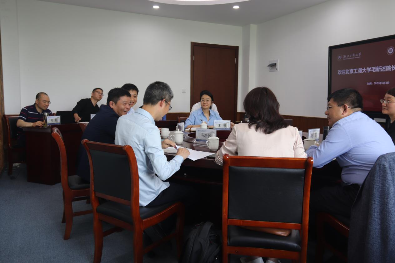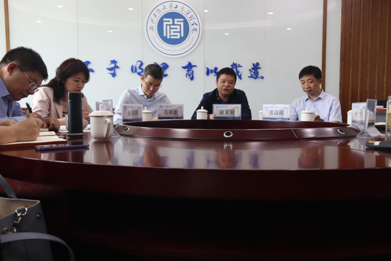 在浙江工商大学工商管理学院,院长俞荣建、党委书记孙元、副院长朱玥、岑杰和会计学院党委书记裘益政等参加了交流座谈,详细介绍了学院学科专业特色与博士点建设、党建与业务深度融合的情况、数字化转型的举措以及人才引进情况、学院研究中心的设置与科研推进等情况,双方就商科数字化转型、师资队伍建设、商科国际认证、专硕招生与研究生培养、校友工作的拓展等进行了深度交流。