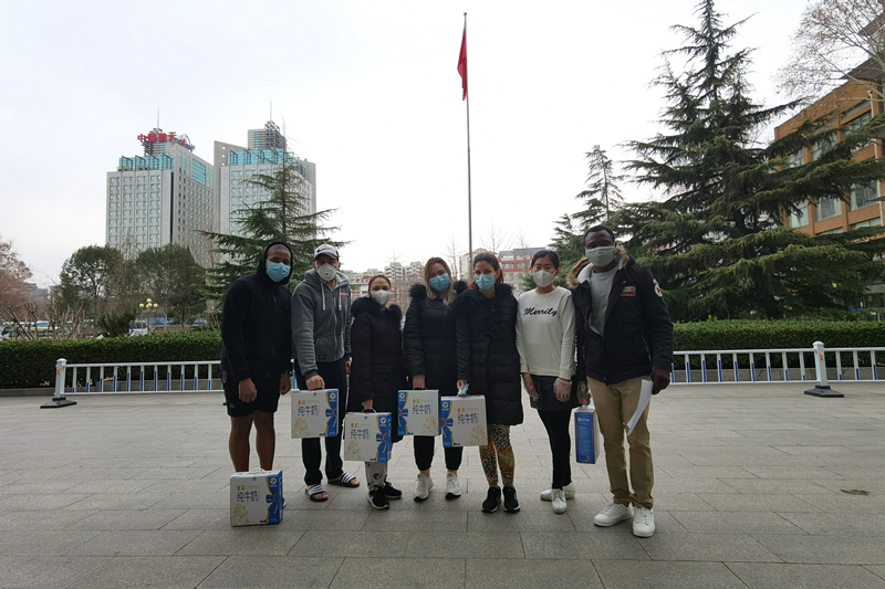 MBA学子工作后又重返校园,心怀感恩与责任,他们在MBA联合会的组织下为每位留校学子捐赠一箱牛奶以及饮料、瓜子、花生等零食。由于疫情防控需要,他们不能返校,由MBA联合会指导老师孙硕代为捐赠。为防止学生聚集扎堆,采取室外发放,错开通知、分散领取的方式。西区留校同学在综合楼外分批领取,东区留校同学在东区南门外分批领取。发放老师佩戴一次性口罩和手套,所有领取同学佩戴口罩并配合保卫处抽查体温。来自利比里亚的留学生JACKSON主动帮老师搬箱子拉小推车,头上冒汗却表示自己“not tired”。来自新疆的维吾尔族同学帕孜来提表示:自己已经大四了,正在网上实习,有了学院的补给,更有动力了。等在东区的留学生远远看到老师拉着牛奶的小推车过来,一起用英文喊:“Thank you,China!”大家和保安大哥们一起开心的笑,仿佛可以驱散所有的阴霾。