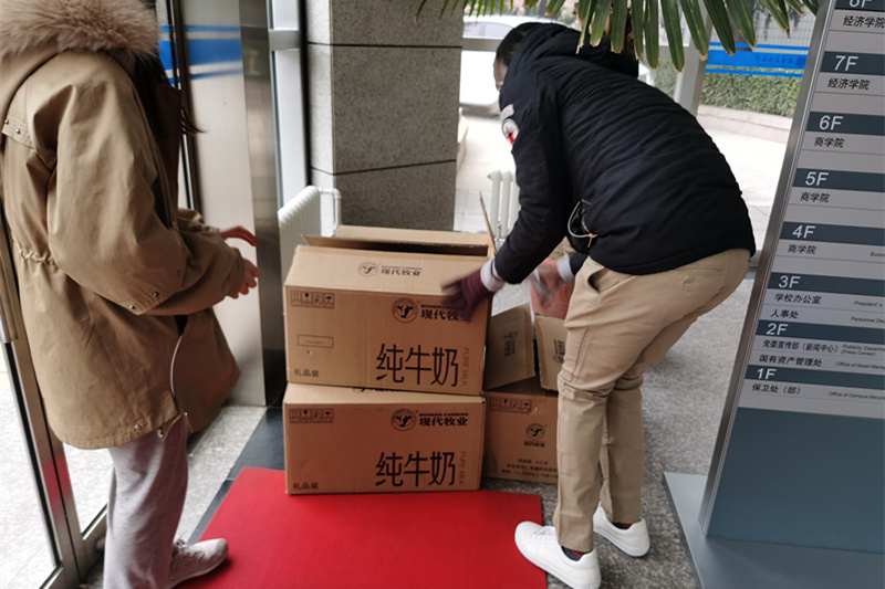 3月2日,时值抗击疫情的关键时刻,我校MBA联合会为欧美无码 留校的30多位中外学子送去牛奶、零食等爱心物资。