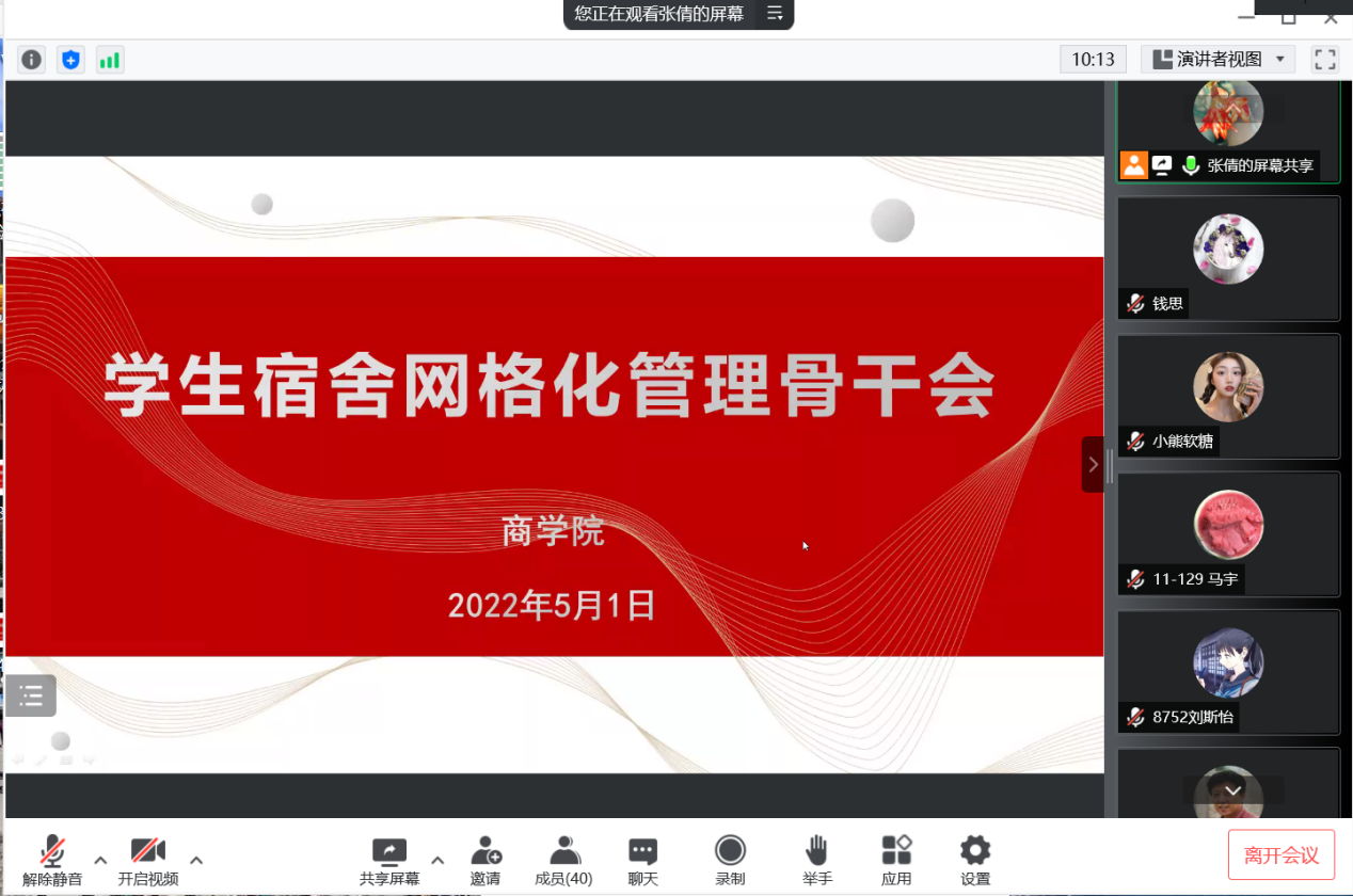 为加强对学生骨干开展防疫教育及应急培训,5月1日,欧美无码 通过线上会议的形式,组织召开学生宿舍网格化管理骨干会。学院党委副书记、全体辅导员、在校本科生和研究生宿舍所有楼长、层长共计40人参加会议。