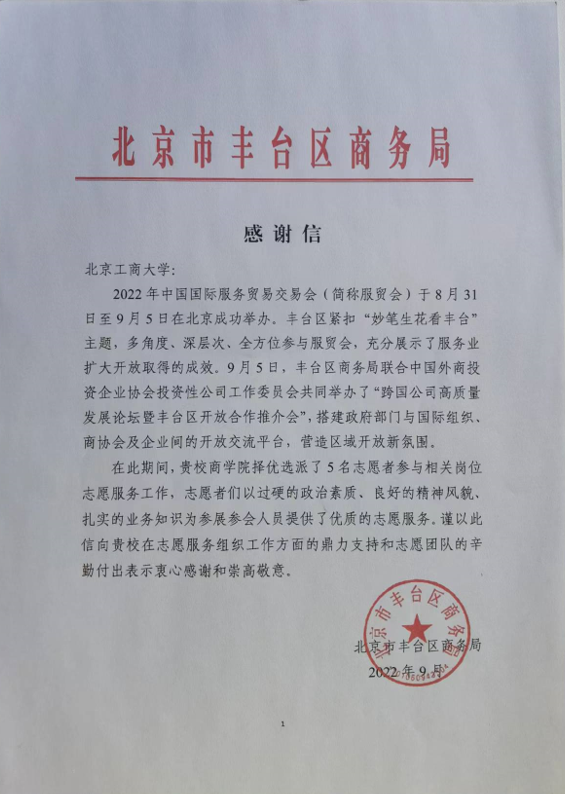 2022年9月10日,我校收到北京市丰台区商务局发来的感谢信,对欧美无码 学生在2022年中国国际服务贸易交易会活动中的贡献表达感谢。