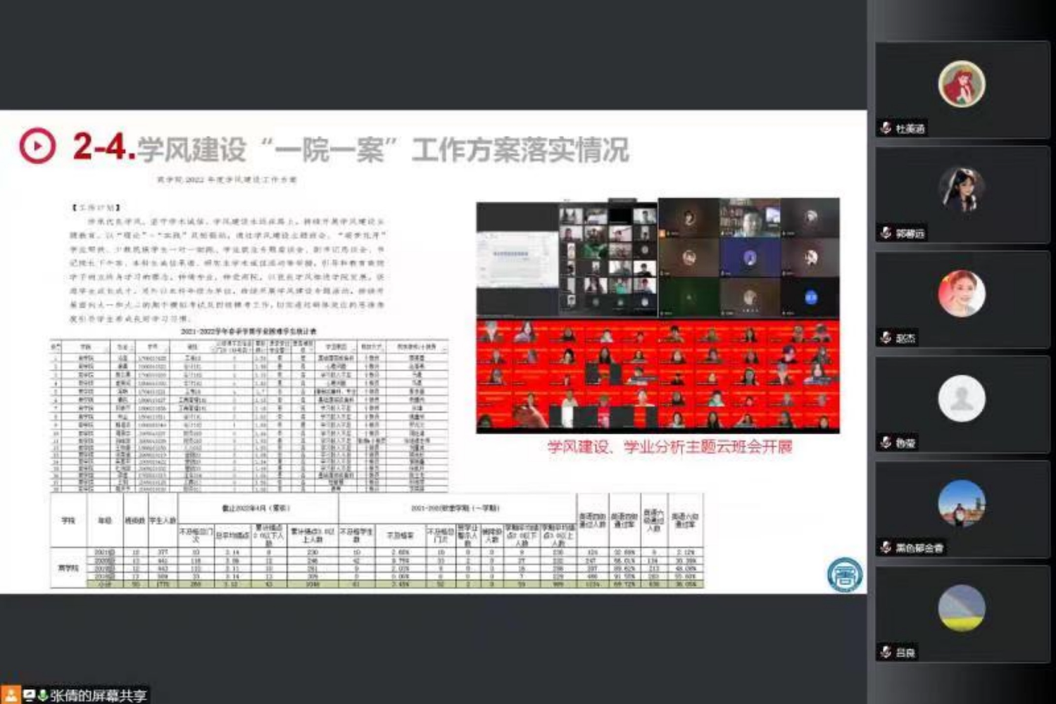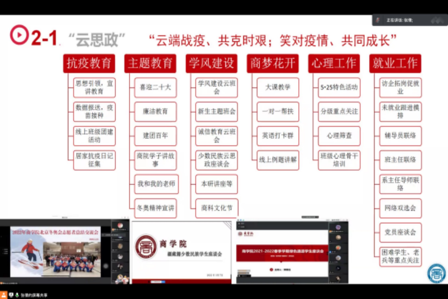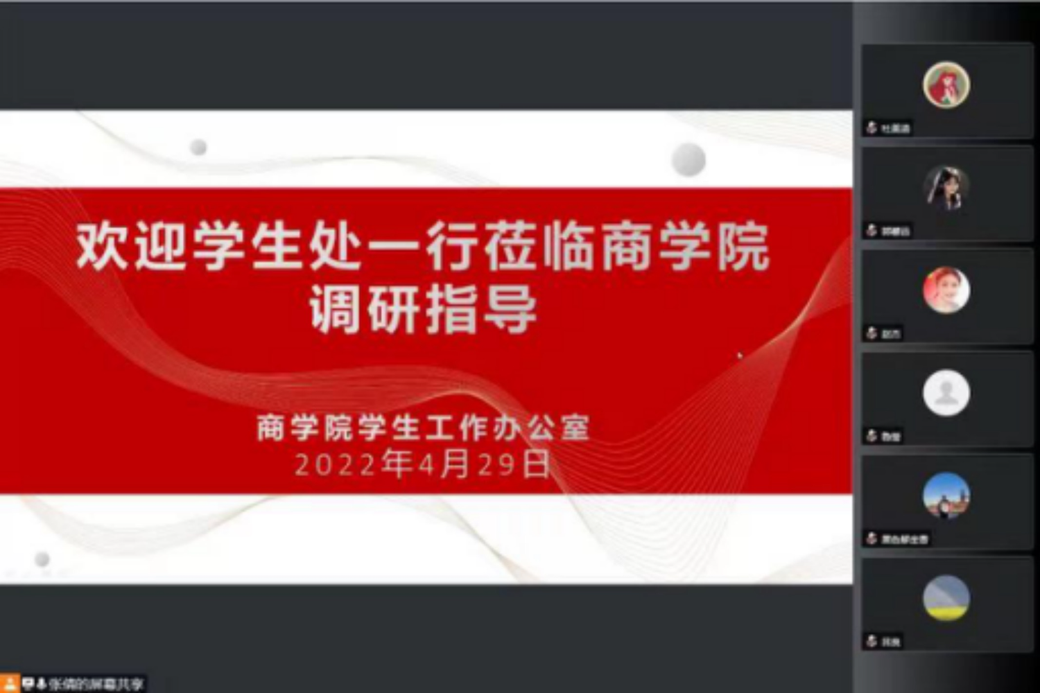 会上,学院党委副书记张倩首先代表学院对学生处莅临指导表示热烈欢迎,并对学生处长期以来对我院学生工作的支持和指导表示感谢。之后,她结合学院学工队伍长期以来形成的“积极动员、及时部署、思想引导、落细落实”的工作理念和思路进行专题汇报。她介绍了欧美无码 学生的基本情况及学工队伍现状,随后围绕云思政工作计划及落实情况、重点关注学生工作开展情况、家庭经济困难学生档案与身份复查情况、学风建设“一院一案”落实情况、心理重点关注学生工作开展情况、学生疫情防控排查工作落实、研究生学术活动“一院一品”建设情况等七方面专项工作开展情况进行了汇报。之后介绍了学院在外培生管理、家校协同等方面面临的问题,希望能够获得进一步的支持。之后辅导员老师们分别就学生线上学习的精神状态、副书记恳谈会开展情况、考研指导纵向交流活动、商梦花开学风传承示范基地建设等方面进行了补充汇报。