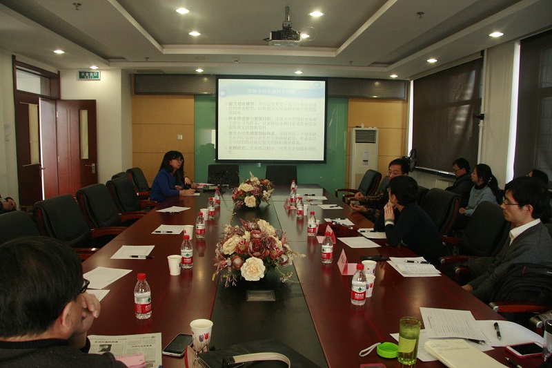 首先,朱蓉老师给我们介绍了制度合法性对企业社会责任战略及绩效的影响研究,朱老师由一个模型出发,提出了制度合法性对企业社会责任战略及绩效的影响机制,进而提出了该课题拟解决的关键问题及创新之处。孙宝文教授对该题目提出异议,并建议通过详细的文献综述来找出问题。邓春平教授也建议找一个更好的落脚点。随后,李宁老师给我们介绍了B2C环境下顾客参与价值共创驱动机制研究,李宁老师从研究目标出发,提出了基于互动模型的顾客参与价值共创框架图。孙宝文教授认为该研究课题的问题导向不清,建议进一步明确研究的问题。接着,杨阳老师给我们介绍了基于经理自主权视角的中国企业海外投资进入战略整合研究,杨阳老师从目前的研究现状出发,引入经理自主权的理论视角,重点围绕海外进入模式的选择提出了新的概念模型。之后,周燕老师给我们介绍了组织文化的个体转化机制研究,周燕老师从研究现状及研究意义出发,主要研究组织认同在组织文化个体转化中的作用、组织文化吸引力与组织认同及组织沟通在组织文化吸引力与组织认同关系间的中介作用,提出了本课题的研究思路及研究方法。金冬梅老师给我们介绍了组织伦理气氛对组织承诺、员工周边绩效的影响研究,金冬梅老师从研究的目的和意义、研究的依据及模型、研究的思路和方法、研究的创新和价值及研究的计划和预期五个方面进行了阐述。李春玲老师给我们介绍了高校教师绩效薪酬对工作卷入度的抑制机制研究,李春玲老师认为目前针对高校的绩效薪酬研究较少,提出了薪酬考核新的方式。以上几位老师阐述之后,另外老师向孙宝文教授请教如何选有意义的题目,以及选什么样的题目适合申报国家社会科学基金、什么样的题目适合申报国家自然科学基金。孙宝文教授以一些有趣的生活事例为各位老师作了解答,孙宝文教授告诉我们社会科学研究的是具体的管理问题,而自然科学是在方法上的创新。
