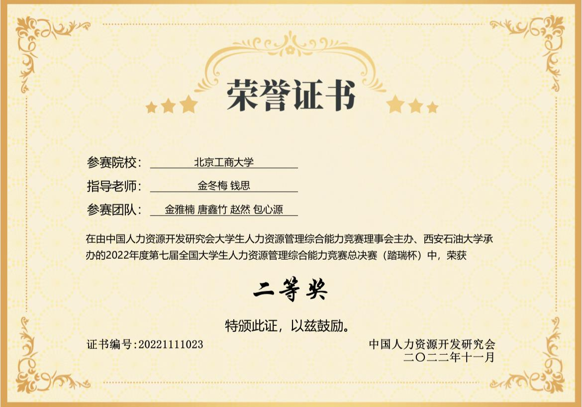 第七届全国大学生人力资源管理综合能力竞赛(踏瑞杯)全国总决赛于2022年11月5日下午举行。欧美无码 人力201金雅楠、赵然、唐鑫竹、人力202包心源组成的代表队,在金冬梅、钱思两位老师的指导和带领下,获得了北京赛区特等奖并成功晋级决赛,代表学校参加本次全国总决赛,并取得了全国二等奖的优异成绩。