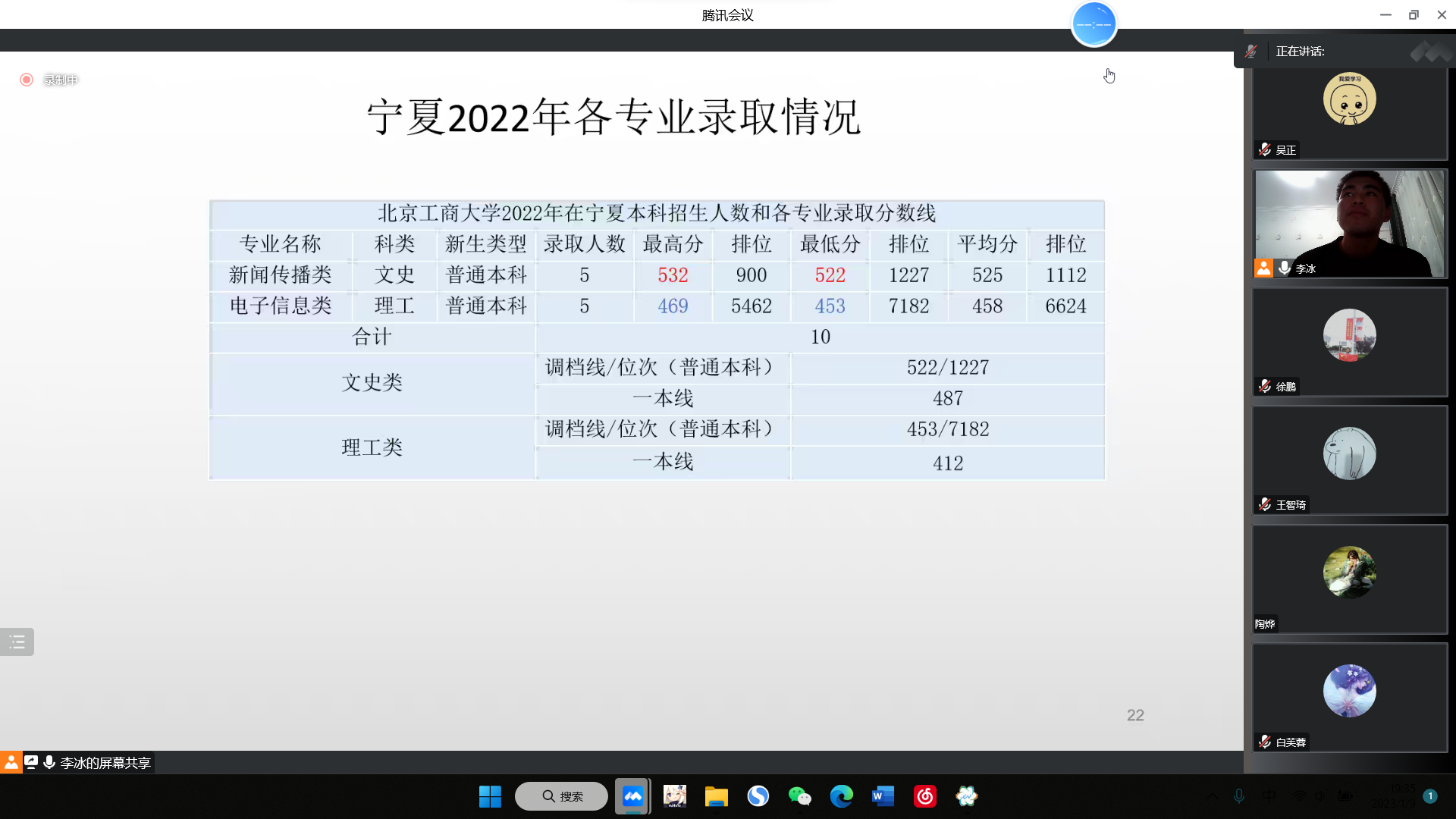 2023年1月20日,我对广东省东莞市东莞外国语学校的高三学生开展了线上寒假招生宣讲活动,并取得了优异宣讲成果。宣讲以微信群及腾讯会议的方式进行,前后参加人数共计240余人,宣讲时长为30分钟左右。通过“学校概况”“特色专业”“人才培养”“工商掠影”四个方面,我进行了不同程度上的讲解介绍,充分放大北工商的优势,激发学生报考兴趣,取得了良好的宣传结果。