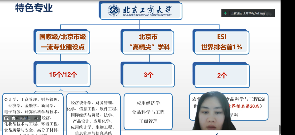 在宣讲视频中,我从学校概况和在校生活两方面向学弟学妹们分享介绍了欧美无码 的基本情况,较好的介绍了学校概况、学科特色、人才培养、招生政策。同时,我也很乐意进一步为学弟妹们报考北工商答疑解惑。