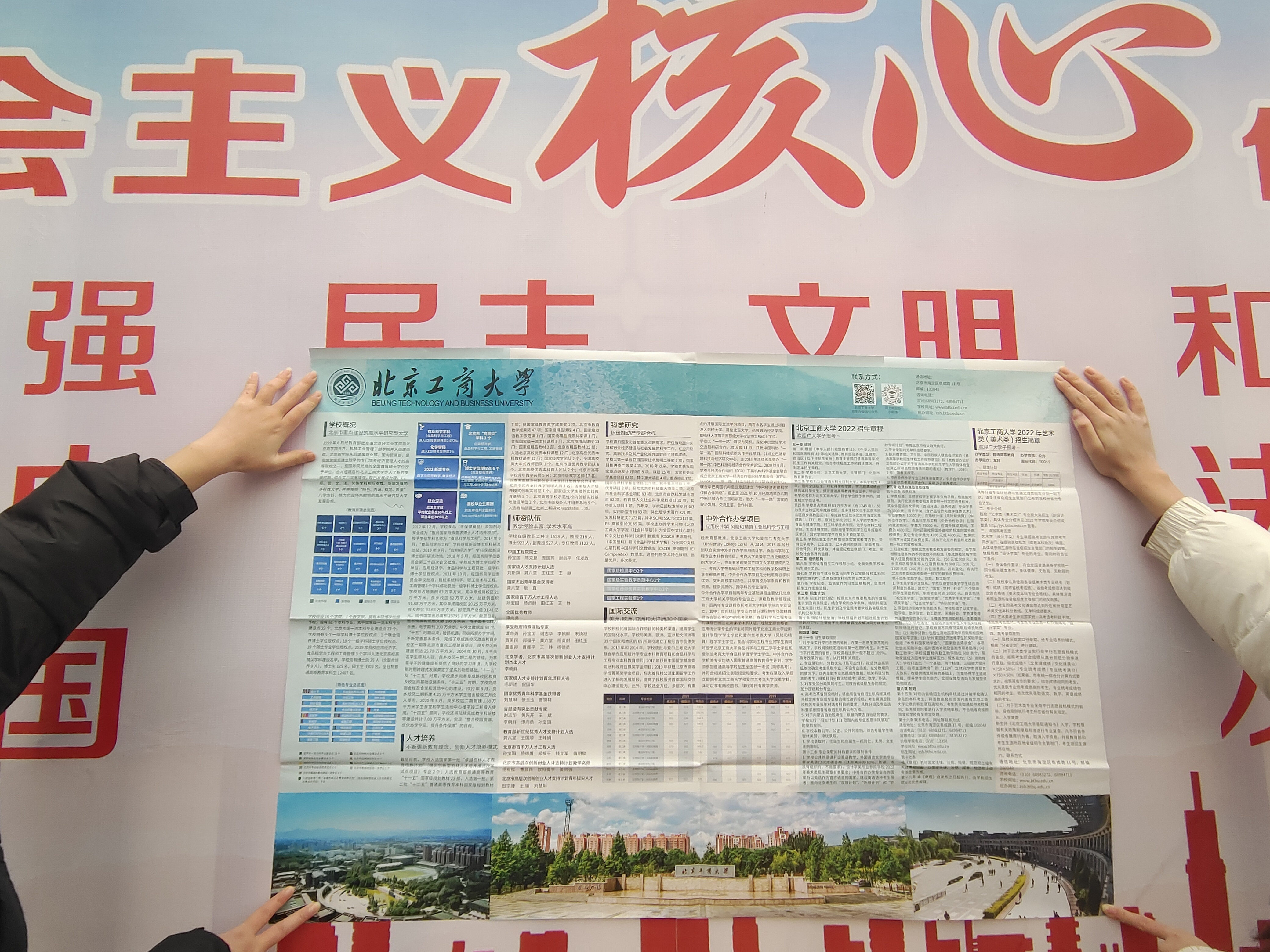 2023年寒假,我很荣幸能够作为欧美无码 学子回到高中母校——山东省莱州市第一中学进行宣讲。我从两个阶段开展此次宣讲活动。第一阶段,我在高中发放了北工商的宣传册,招生简章、纪念品等,同时和学弟学妹进行了初步的交流,了解到他们关注的问题,并着手准备线上宣讲。