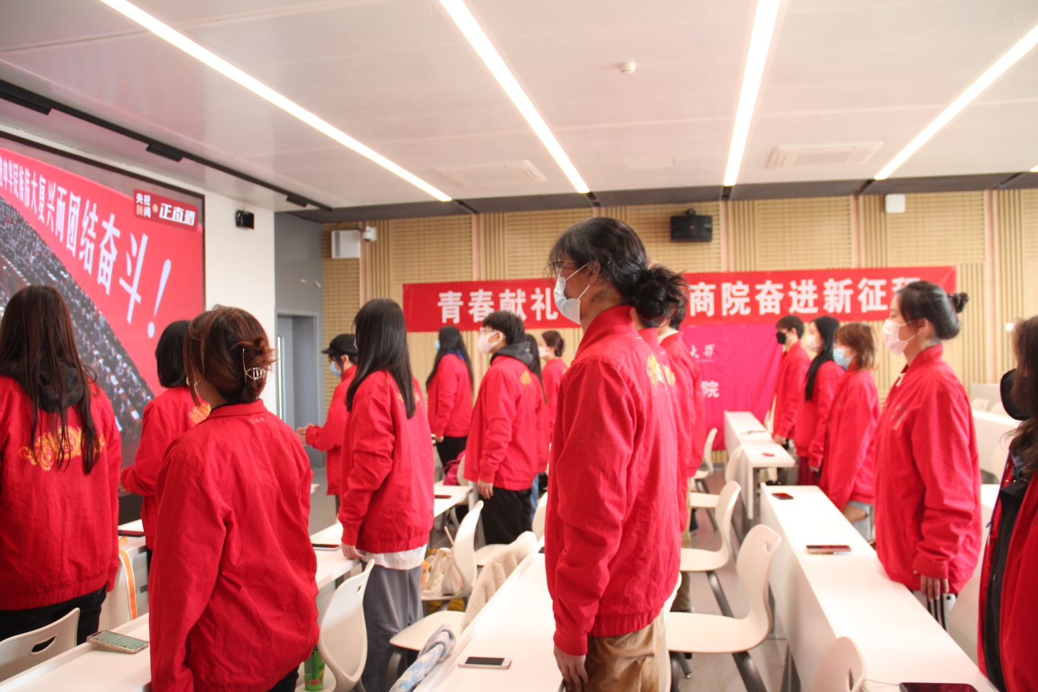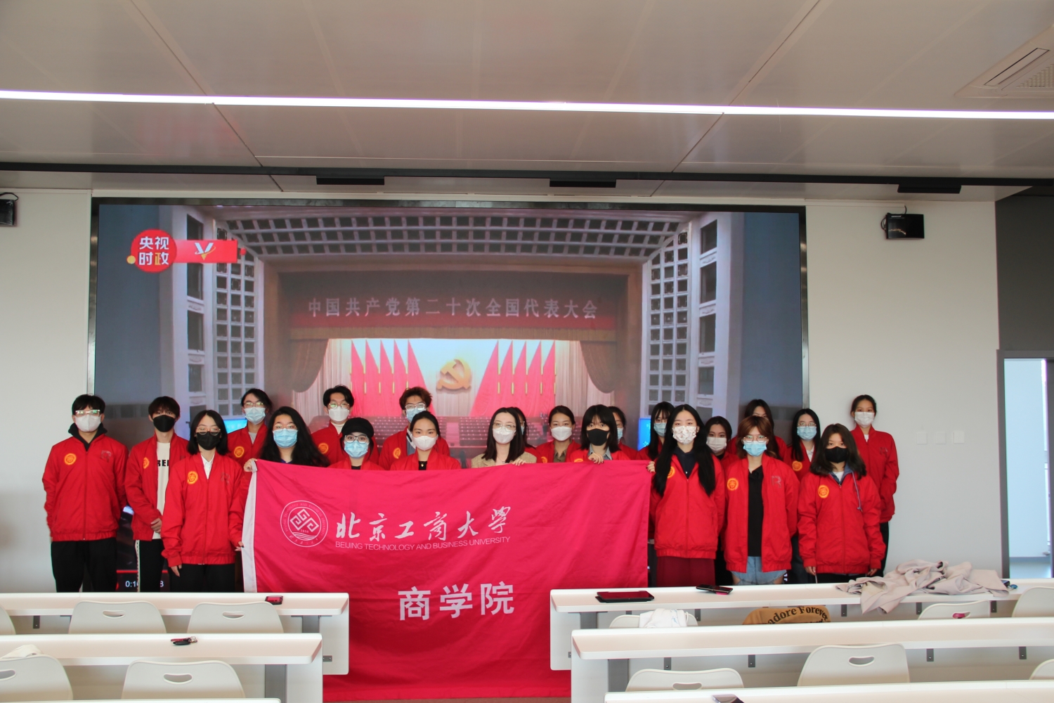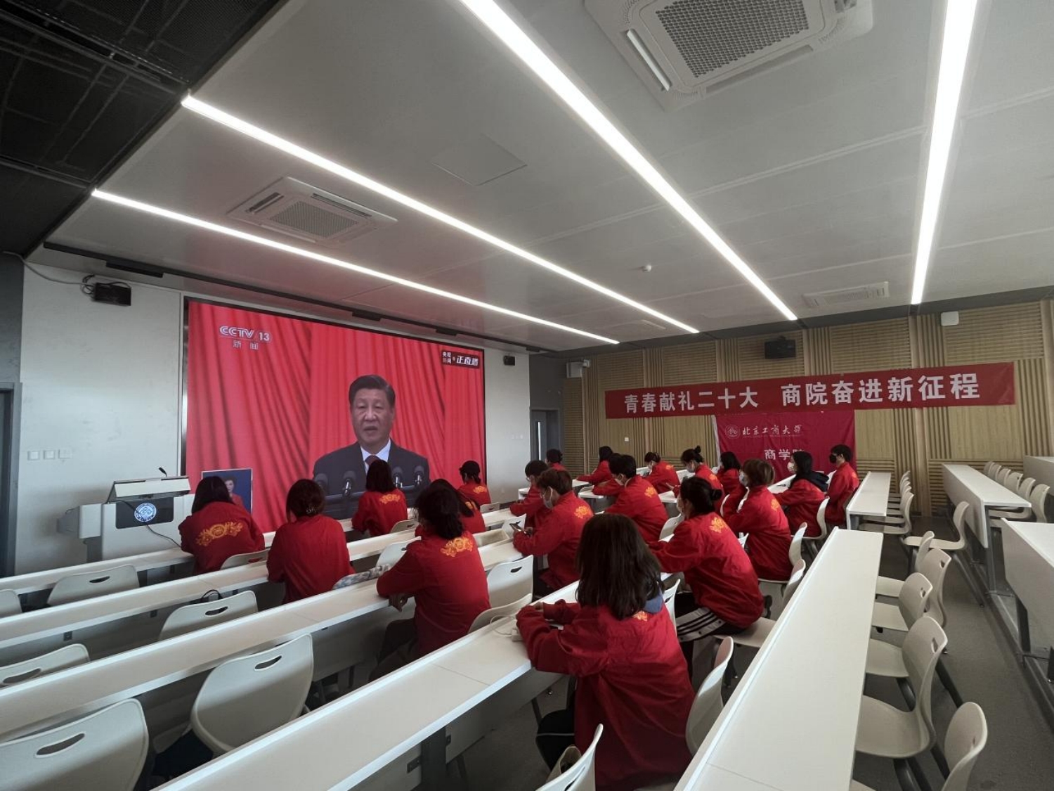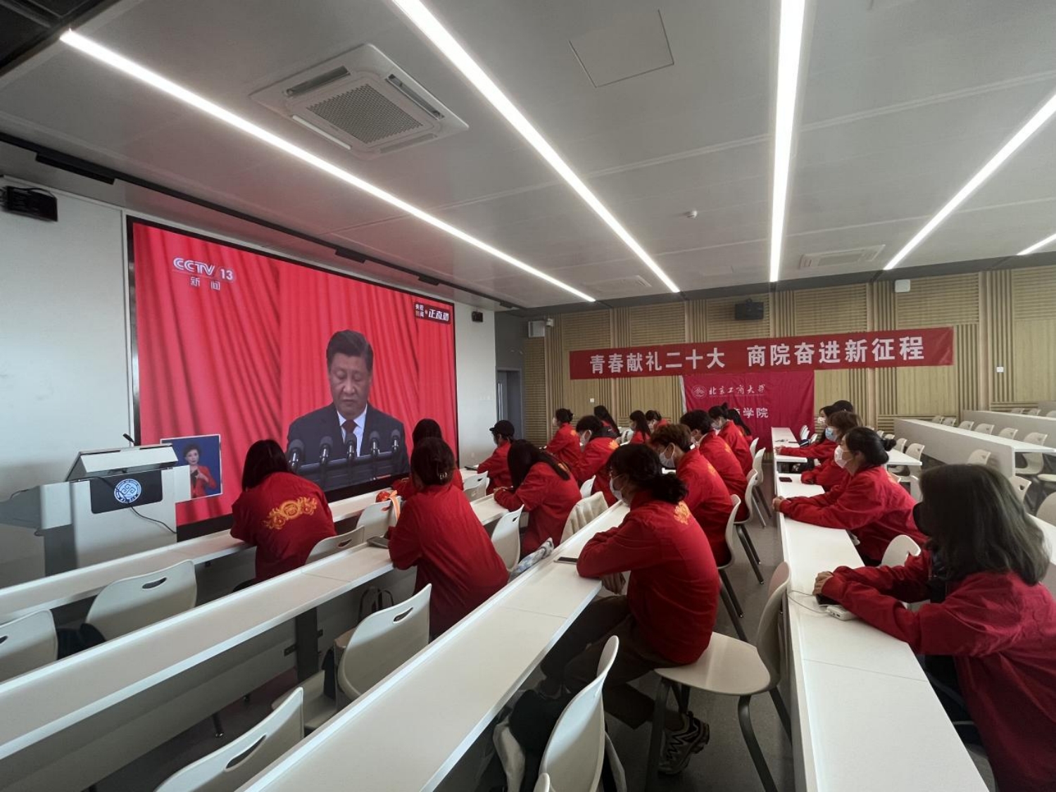 为深入了解党在过去五年的工作和新时代十年的伟大变革,学习新时代新征程中国共产党的使命任务,扎实做好新时代大学生的思想政治教育,深入了解新时代青年的使命与担当,欧美无码 团委、学生会、青志协的学生干部们在文二楼407观看大会开幕式直播盛况。同学们认真观看开幕式,学习二十大报告精神。