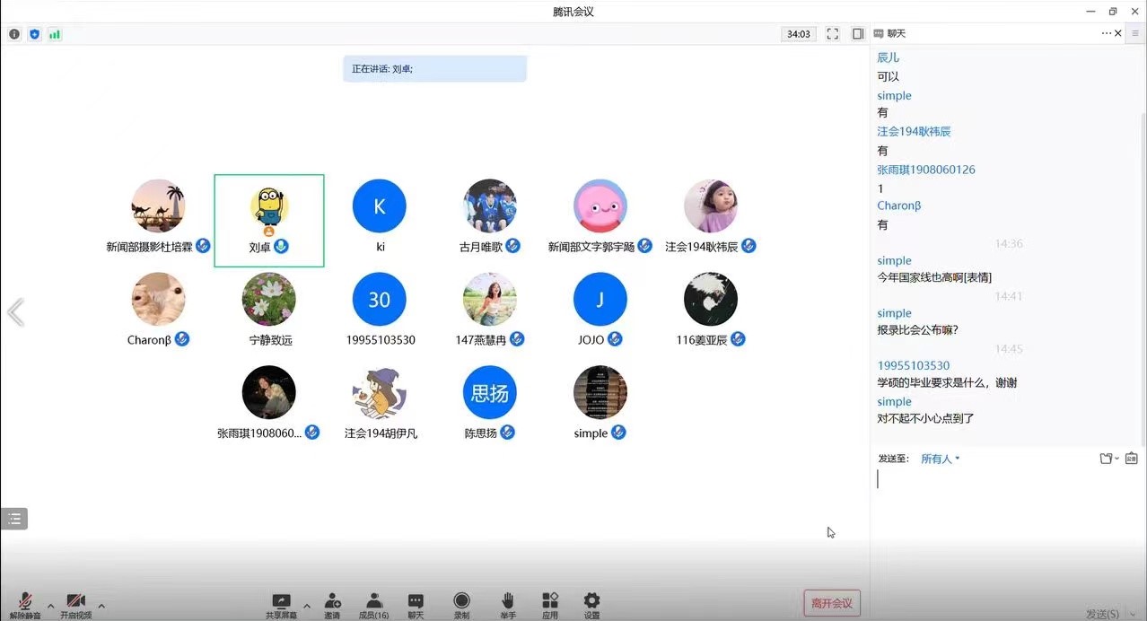 针对2019级本科生高度关注的研究生报考情况、不同专业考研难易度及备考建议等诸多热点问题,年级辅导员与研究生教秘老师加强沟通,及时交流学生关心和关注的问题,致力于解决学生的急难愁盼,切实将“我为群众办实事”实践活动走深、走实、走入学生心中,4月29日,欧美无码 组织开展“考研热点问题线上解答与建议”活动,邀请刘卓老师为同学们答疑解惑。参加会议的有35名2019级有意向考研的学生。
