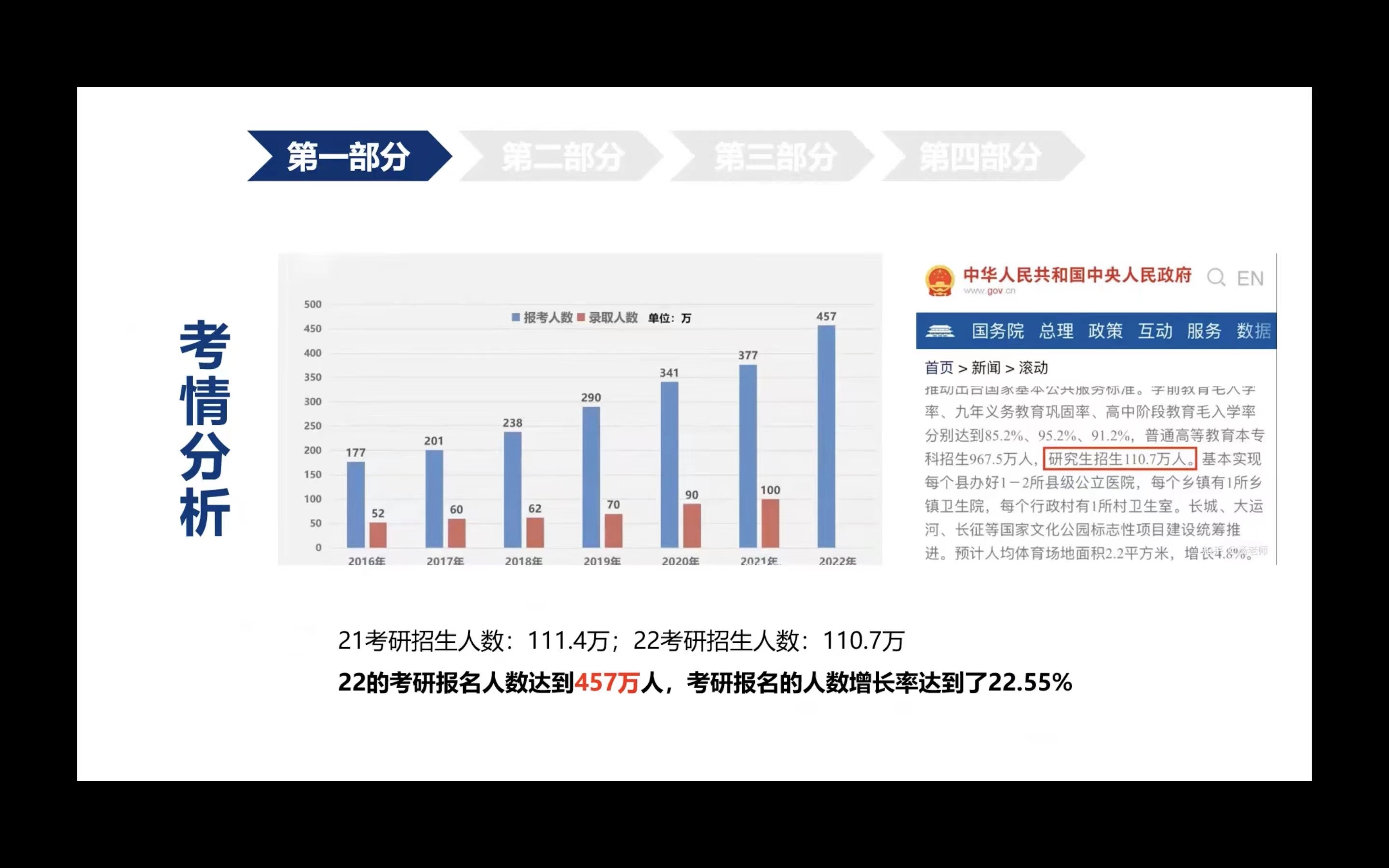 段晓洁是初试第一名且三跨成功上岸的企业管理专业学生。她首先分析了最新的考研形势,2022年考研竞争非常激烈。之后,她就如何调整考研心态进行了分享交流,她认为选择合适的目标院校非常重要,关键是要进行自我纵向比较,要积极调整心态。最后,她结合自身经历对英语、政治、数学等课程有针对性复习的准备安排提出了非常重要的建议。