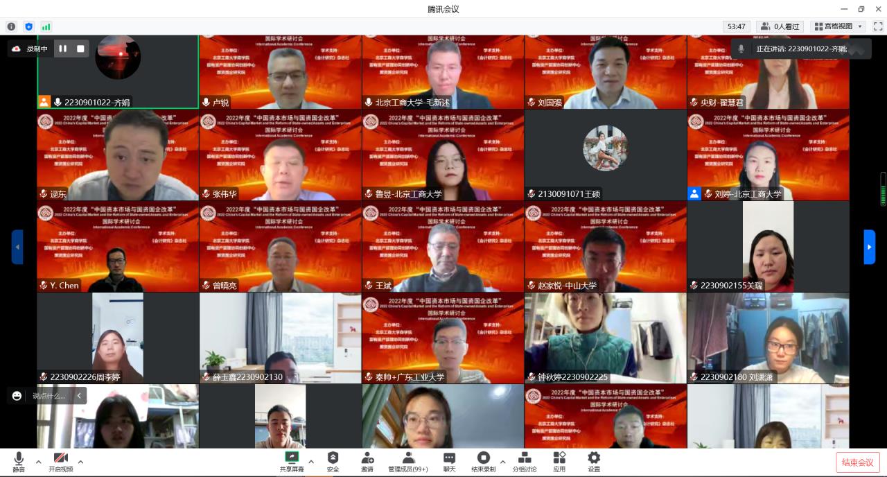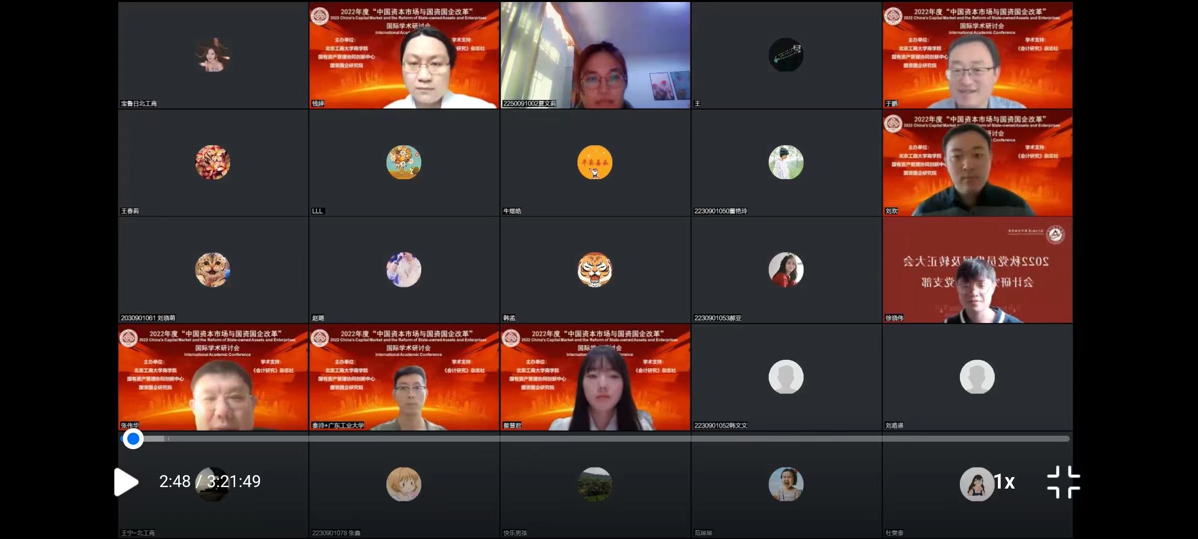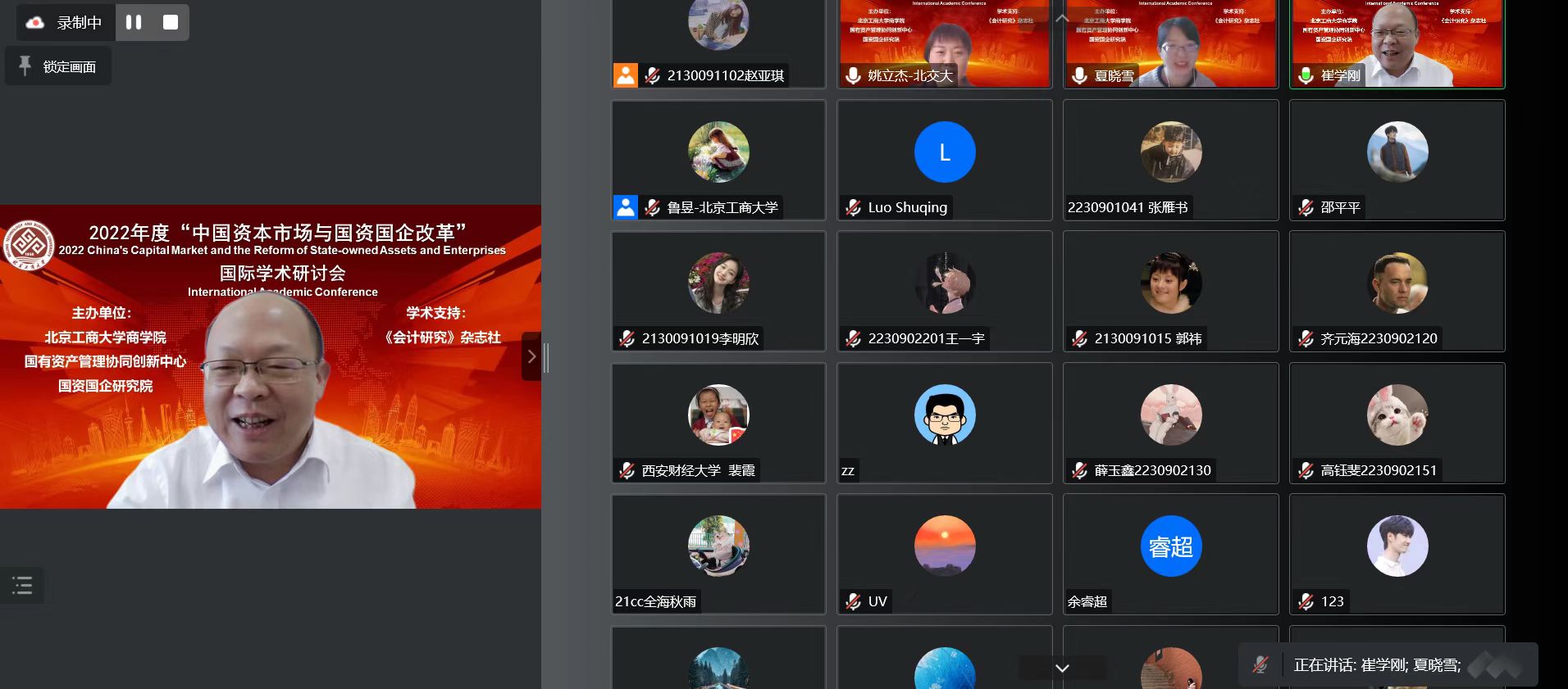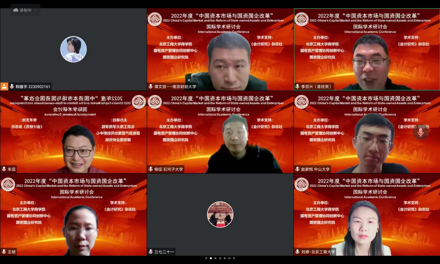2022年11月26日,第二届“中国资本市场与国资国企改革”国际学术研讨会采用线上会议方式隆重召开。我校副校长龚六堂教授出席会议并致辞,我校原副校长谢志华教授出席并参加了会议。香港大学、澳大利亚麦考瑞大学、香港城市大学、中国南方科技大学、中国人民大学、厦门大学、复旦大学等30余所高校的专家学者、我校研究生院院长兼欧美无码 院长毛新述教授、欧美无码 副院长张伟华教授、我校欧美无码 教师和研究生参加了此次会议。