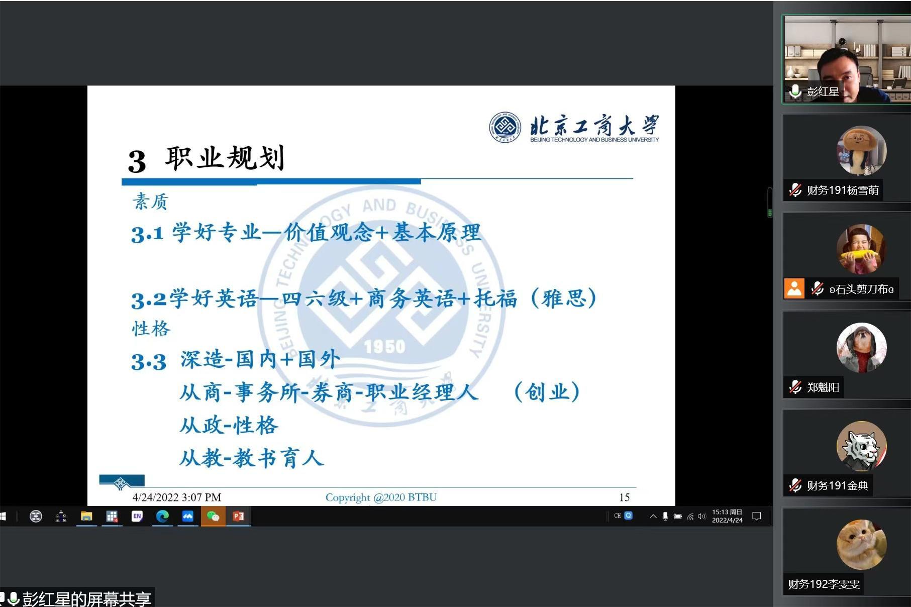 财务管理系副主任彭红星副教授从准确定位自己、树立正确的就业观、认真分析就业形式几个要素来向同学们讲述了自己对利用最后一年多的大学生活提升自己并做好职业规划准备的看法,使大家受益匪浅。彭教授认为同学们应当给自己做出一个正确的评价,每个人的性格不同,每个人都有自己的兴趣爱好,因此每个人要根据自己的实际和需求来选择职业;要抓住自己的特点,发挥自己的优势,尽量避开自己的不足,这样才有可能使你在择业竞争中占据主动。